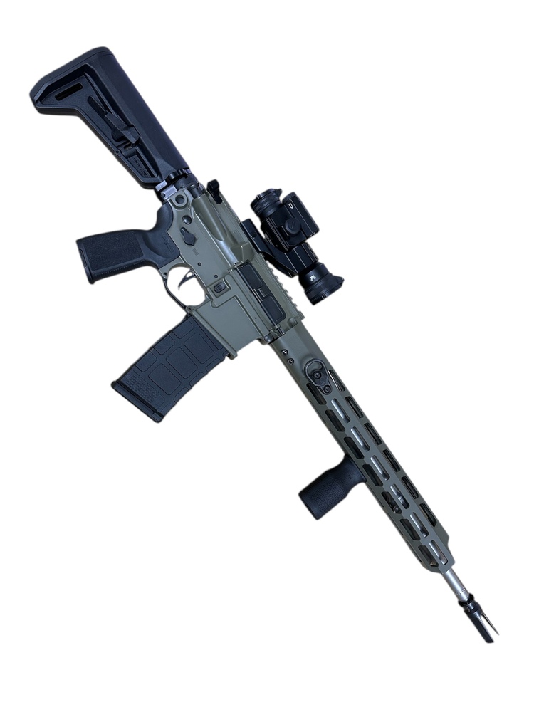 SIG SAUER MODEL M400 (TREAD V2), SEMI AUTOMATIC RIFLE, CHAMBERED IN 5.56 NATO. MOSS GREEN, COMES WITH VORTEX STRIKEFIRE II RED DOT SIGHT, 2 MAGAZINES, & MAGPUL FOREGRIP/SLING MOUNT. ALL FIREARM PURCHASERS MUST COMPLETE AND PASS A BACKGROUND CHECK.