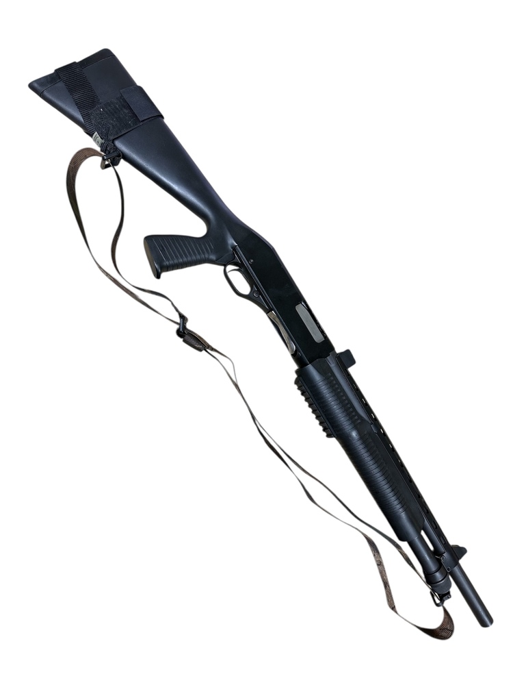 STEVENS MODEL 320, PUMP ACTION SHOTGUN, CHAMBERED IN 12 GAUGE. 18 INCH BARREL, COMES WITH SLING & CHEESE GRATER HEAT SHIELD/SIGHT RISER. ALL FIREARM PURCHASERS MUST COMPLETE AND PASS A BACKGROUND CHECK.