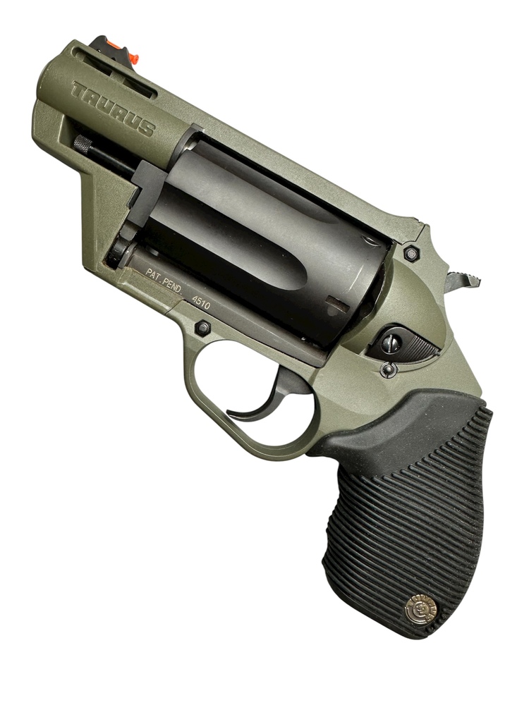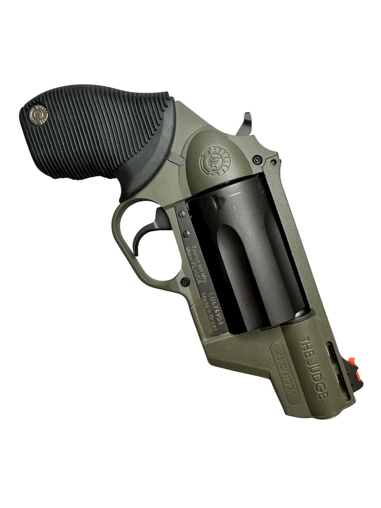 TAURUS MODEL THE JUDGE (PUBLIC DEFENDER POLY), SEMI AUTOMATIC HANDGUN, CHAMBERED IN .45 LONG COLT / .410 GAUGE. OD GREEN FINISH, 5 SHOT CYLINDER. FIREARM IS A HANDGUN AND CAN ONLY BE SOLD TO WV RESIDENTS. ALL FIREARM PURCHASERS MUST COMPLETE AND PASS A BACKGROUND CHECK.