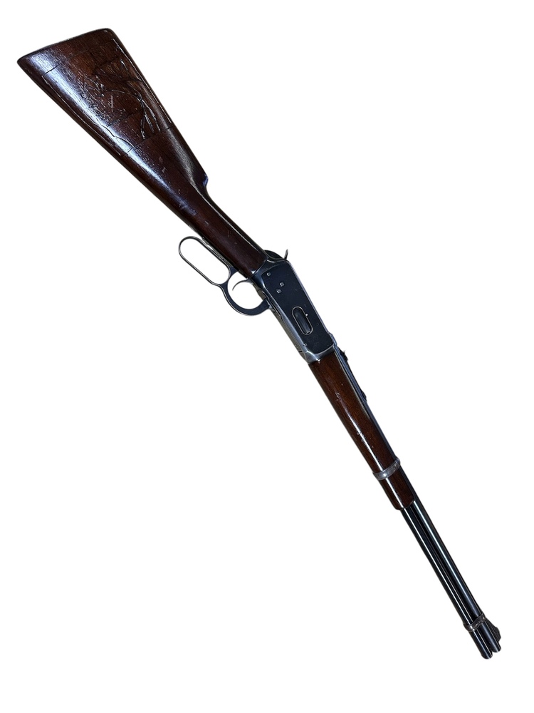 WINCHESTER MODEL 94, LEVER ACTION RIFLE, CHAMBERED IN .30 WCF (30/30). MANUFACTURED 1943-1948. STOCK HAS BEEN CARVED INTO, SEE PICTURE. ALL FIREARM PURCHASERS MUST COMPLETE AND PASS A BACKGROUND CHECK.